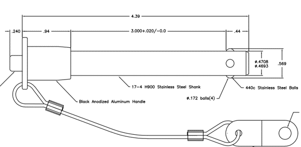 The pin design was done in conjunction with BigSky Manufacturing, one of our contract manufacturers. We needed four ball bearings as a primary constraint on this pin. Normal quick pins only need two ball bearings, but the four-ball ball bearing solution would handle shear forces encountered during the loading process better. We also designed the solution an appropriate length that allowed the ball bearings to hold the multipoint adapter and frame but not protrude too far as to interfere with any other frame components.